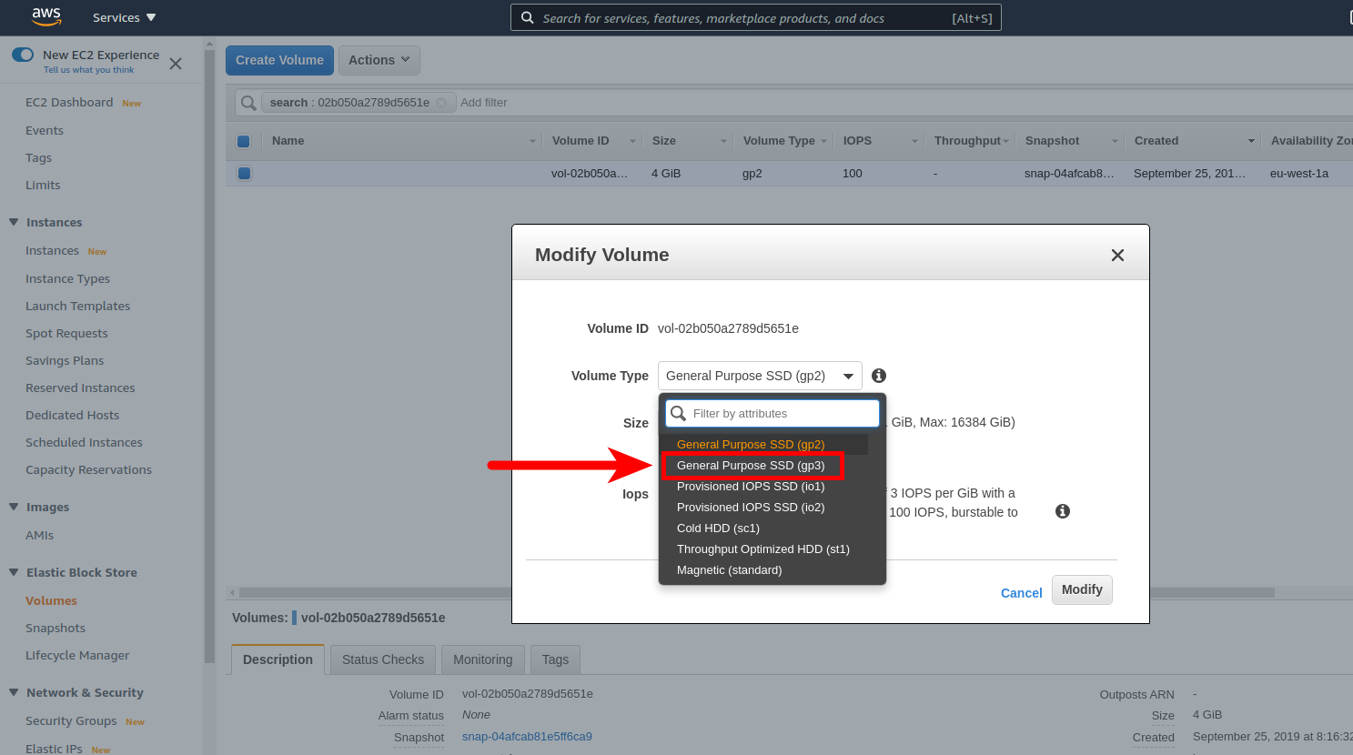 Making the change is extremely simple, just select a volume from the AWS console and change its type like this: